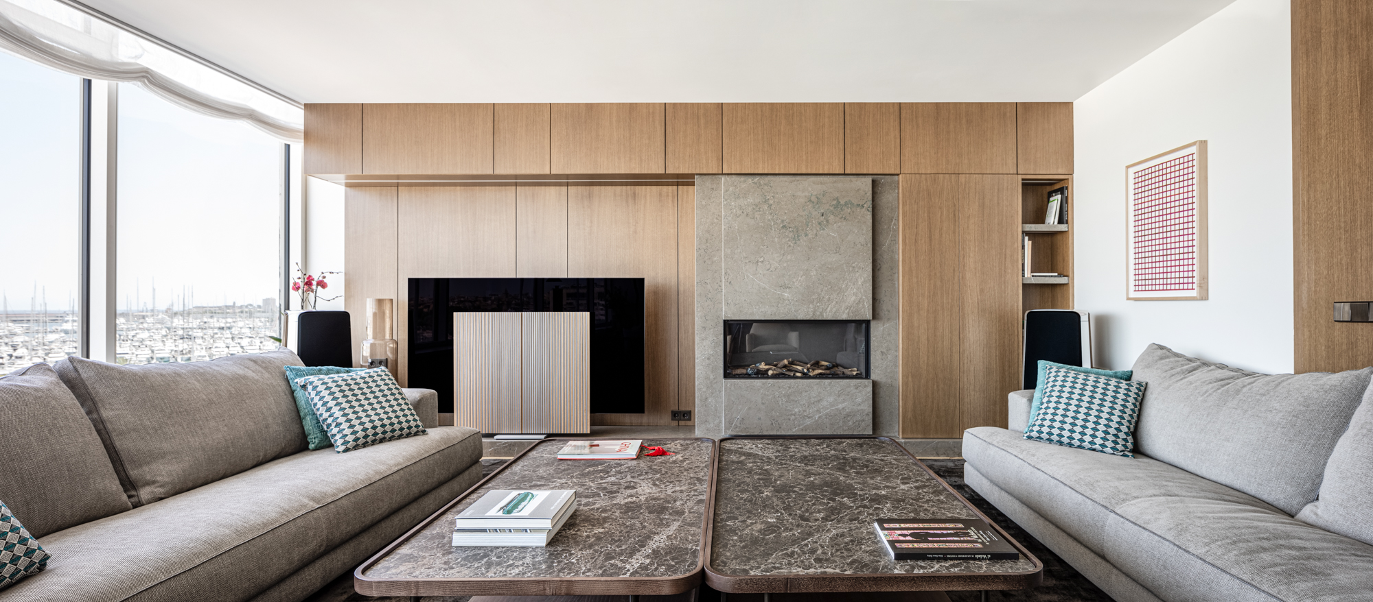 Das Innenarchitekturbüro wollte große, offene und kommunikative Räume schaffen. Um dies zu erreichen, wurden die meisten Trennwände entfernt und Holzpaneele und Regale geschaffen, die die Räume unterteilen, ohne sie jedoch abzuschließen.