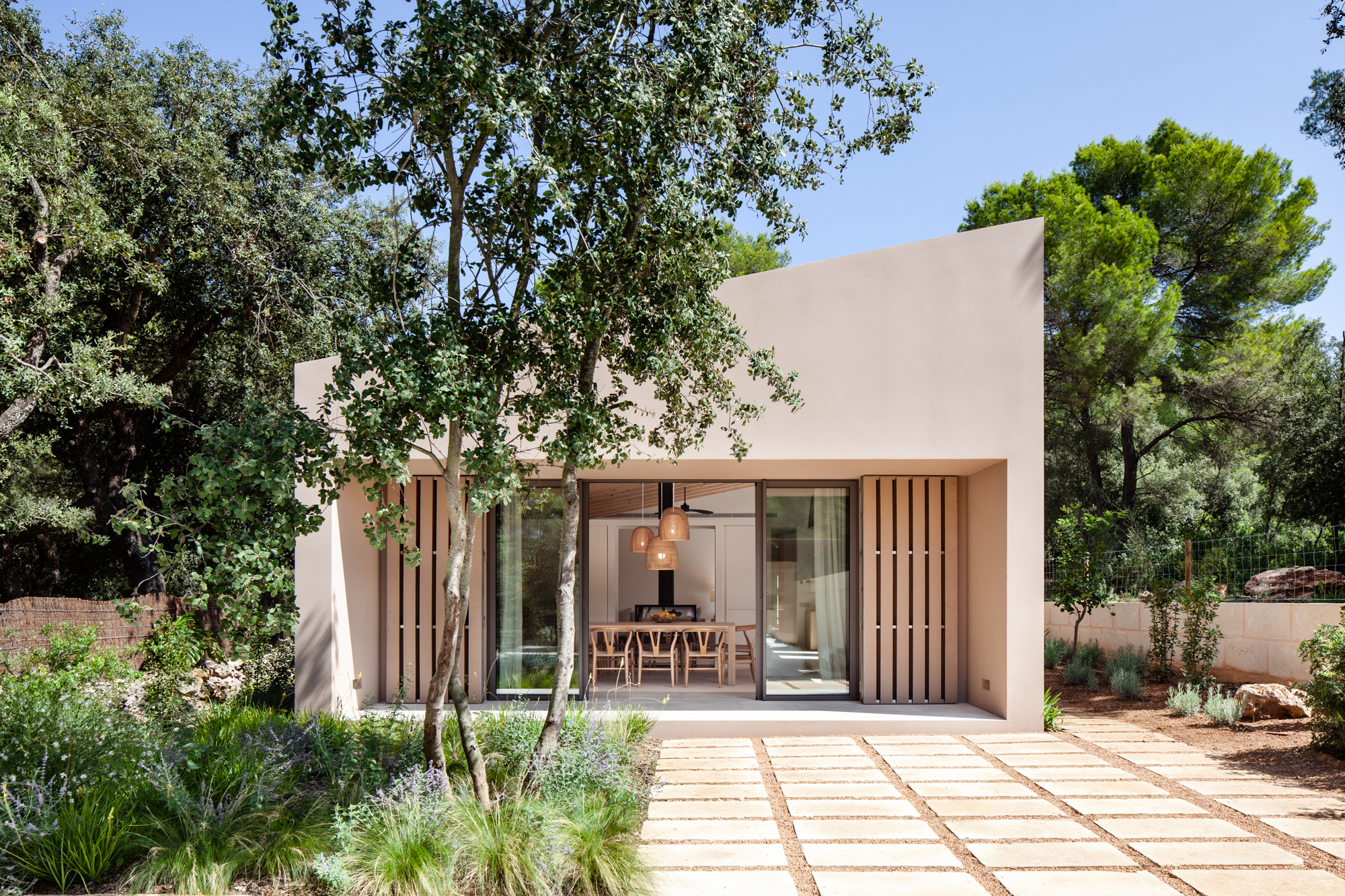 Der zweite Baukörper beherbergt den Nachtbereich, der aus vier Zimmern und drei Bädern besteht und in dem die gleiche Struktur wie im Tagesbereich beibehalten wurde. Der einzige Unterschied zwischen den beiden Baukörpern ist der Bodenbelag, der immer aus natürlichen Materialien besteht: Holz im Nachtbereich und Stein im Tagesbereich. Das Innenarchitektenteam richtete das Haus unter der Prämisse ein, es an die Umgebung anzupassen, und verwendete Holz für die Möbel und die Beleuchtung sowie Leinen für die Textilien.
