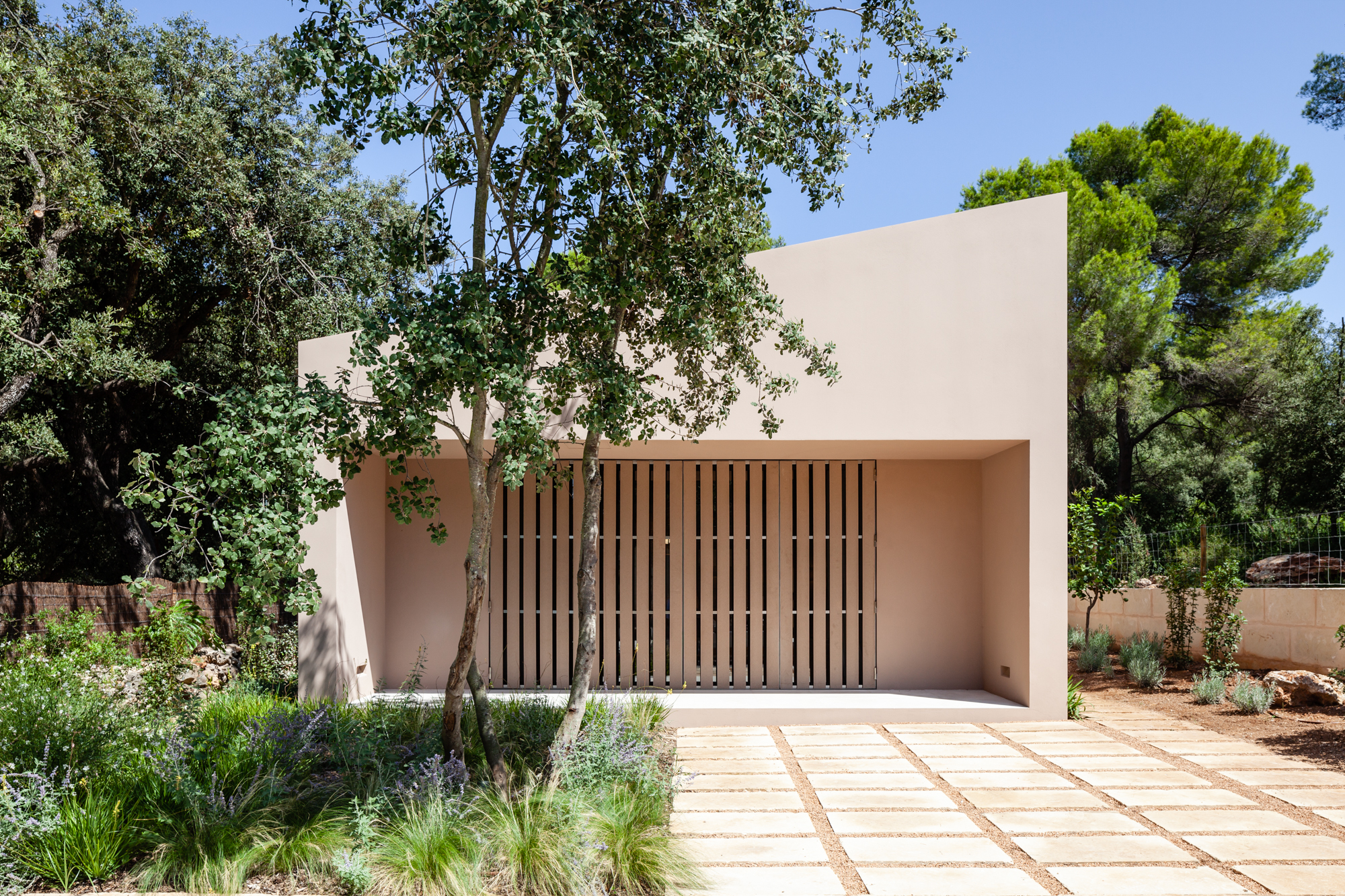 Die Übergangszone zwischen dem ersten und dem zweiten Volumen wurde durch eine freistehende Marés-Mauer gelöst, auf der eine Pergola aus Schilfrohr ruht, und gegenüber befindet sich ein Schwimmbad. Die Marés-Mauer schafft es, den gesamten Außenbereich zu quadratisieren und einen überdachten Außenbereich zu schaffen, der in das Haus als Ganzes integriert ist.