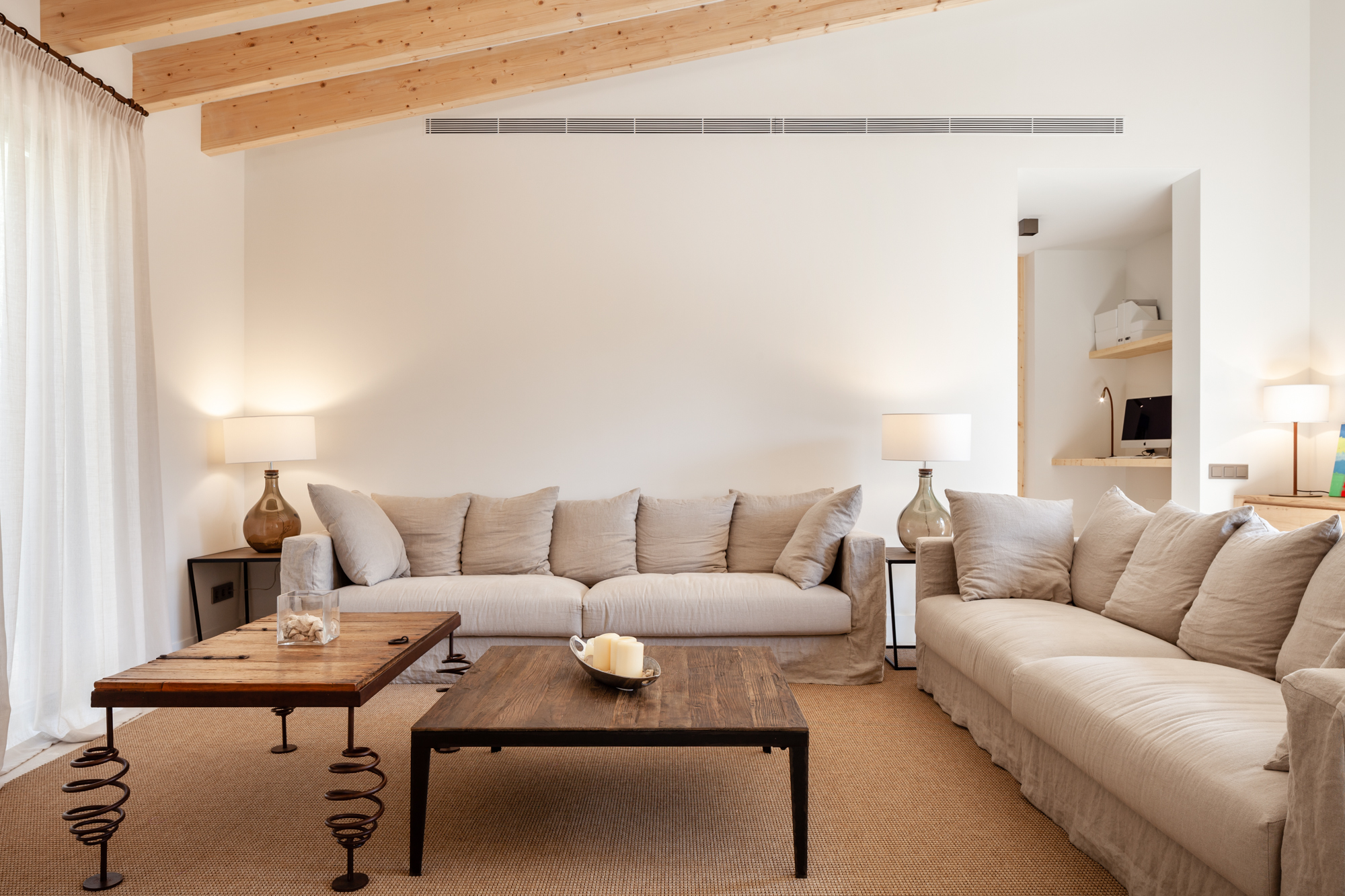 Die Zimmer mit hohen Decken sind mit geradlinigen, einfachen Möbeln eingerichtet, die jedoch auf die Proportionen der Räume abgestimmt sind. Die Innenräume sind offen und sehr geräumig, was ein Gefühl der Frische vermittelt. Um dieses Gefühl auszugleichen und jede Ecke des Hauses angenehmer und einladender zu gestalten, wurden Vorhänge aus natürlichen Stoffen wie Leinen gewählt. Darüber hinaus wurden dekorative Lampen verwendet, um jedem Raum Wärme zu verleihen und ein gemütliches und familiäres Zuhause zu schaffen.