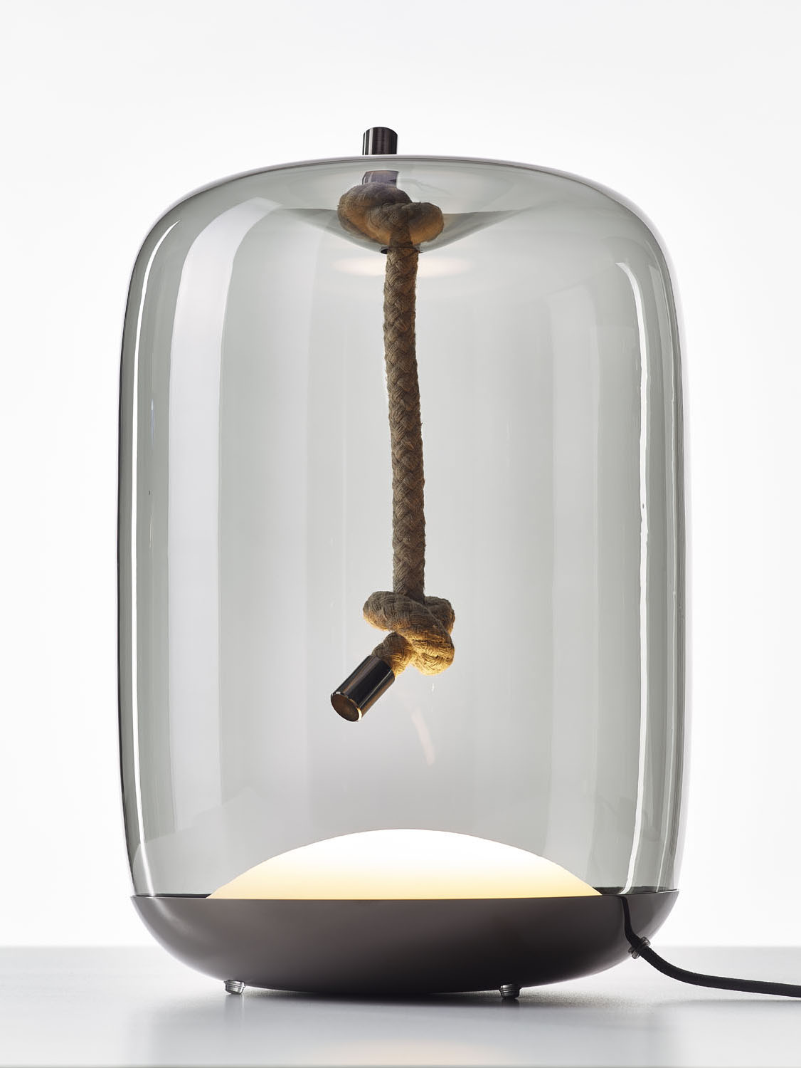 La colección Knot combina magistralmente dos materiales aparentemente opuestos: el delicado y artesanal vidrio soplado a mano y la robustez de una cuerda gruesa. Este contraste crea un efecto visual único, donde el diseño juega con las nociones de suavidad y fuerza, de lo delicado frente a lo crudo.