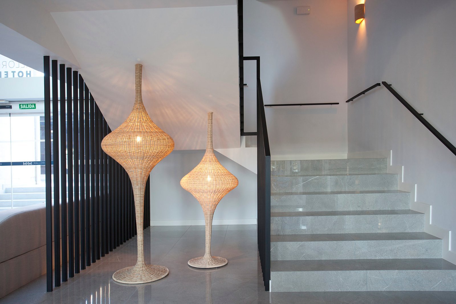 El hotel propone un diseño funcional, fresco, mediterráneo y de fuerte influencia Balear, combinando tejidos autóctonos, esparto, mimbre, caña…todo ello encargado a artesanos de la Isla.
