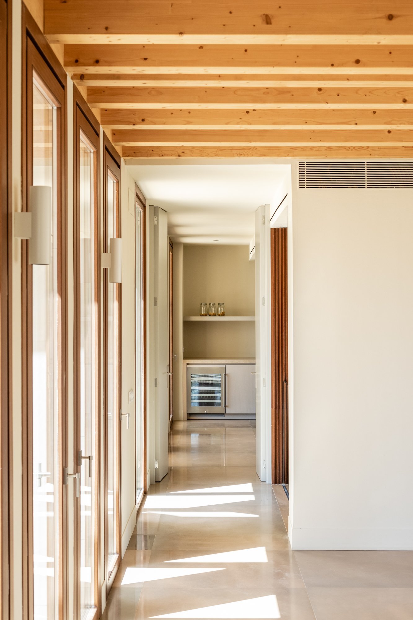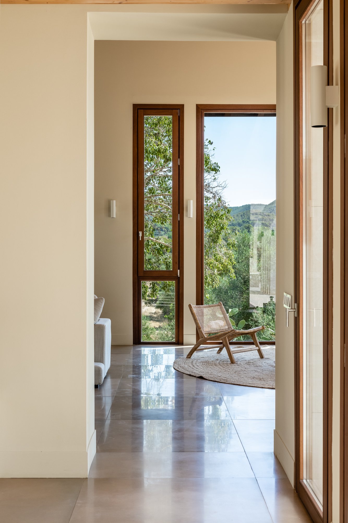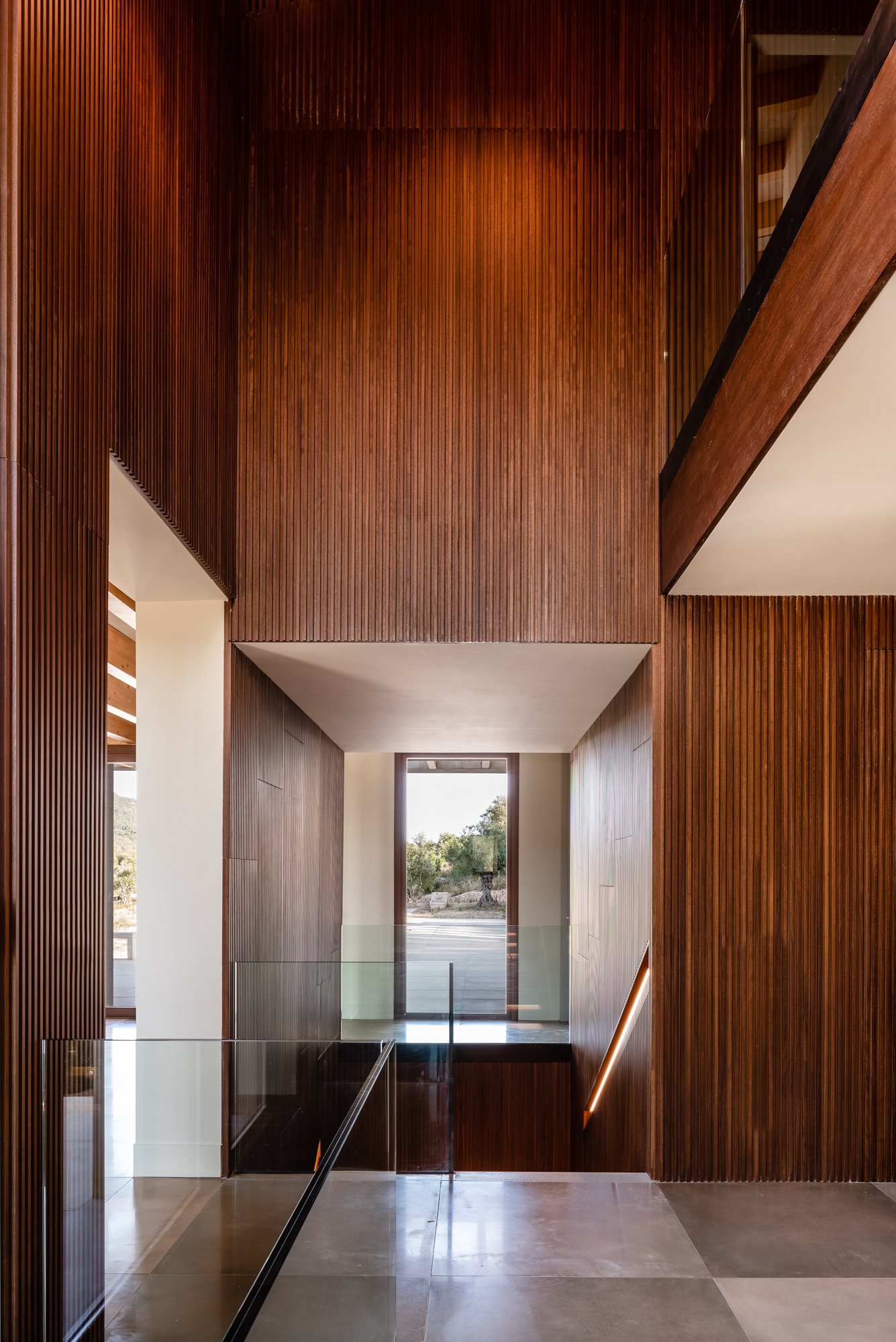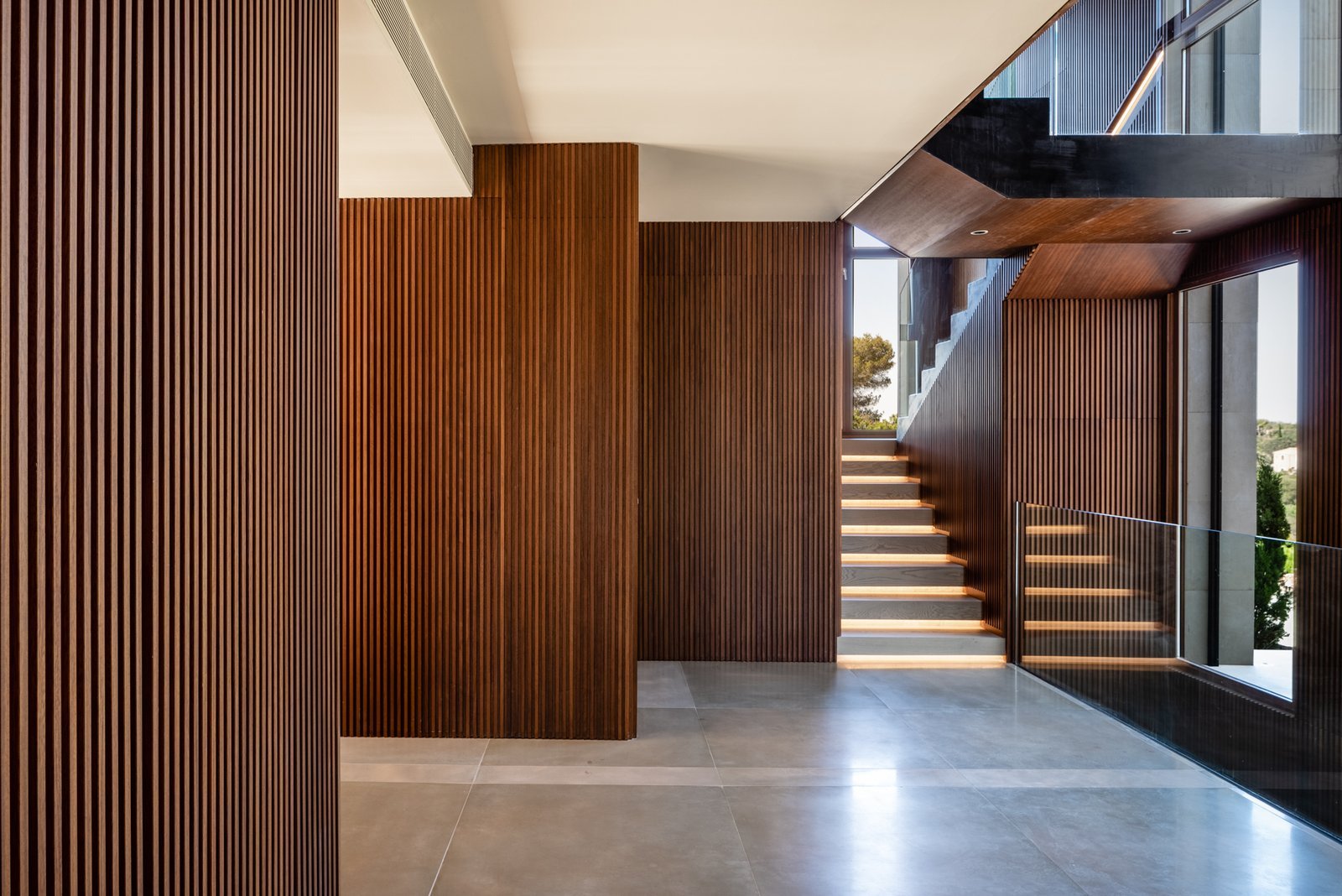 El proyecto pretende mostrar, desde la primera percepción, la totalidad de la vivienda, por eso el recibidor se encuentra conectado con el sótano y con la primera planta a través de un triple espacio, que además coincide con las llegadas y arranques de las escaleras que las comunican y con el paisaje a través del gran ventanal.