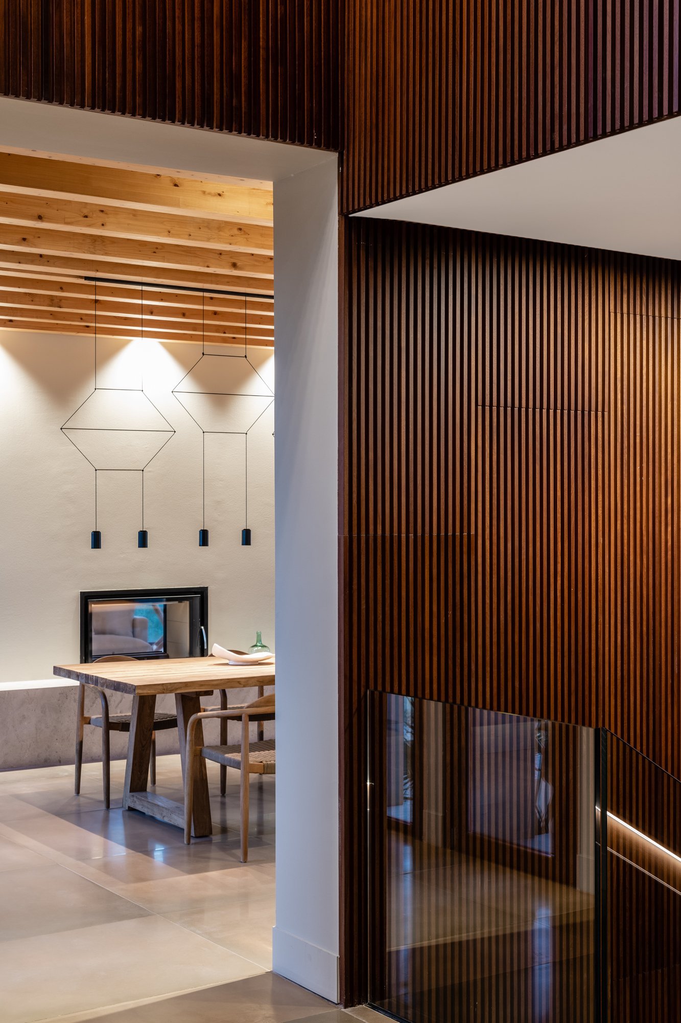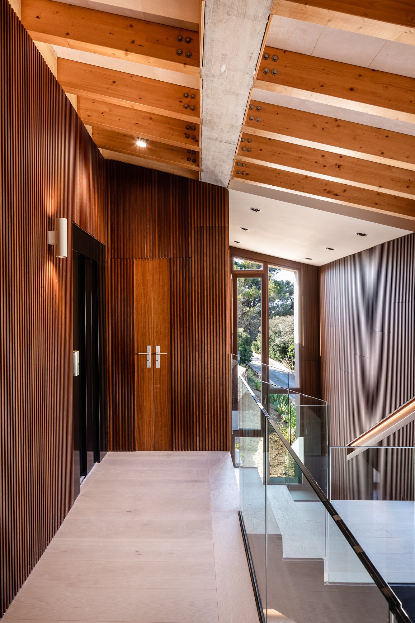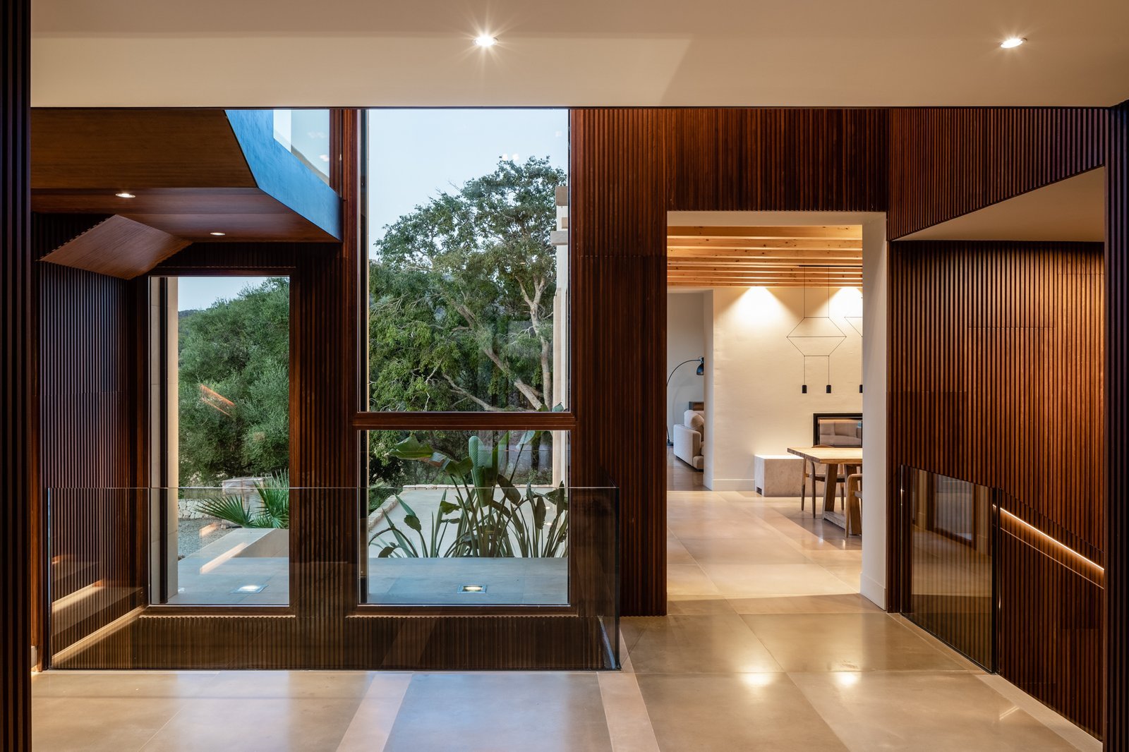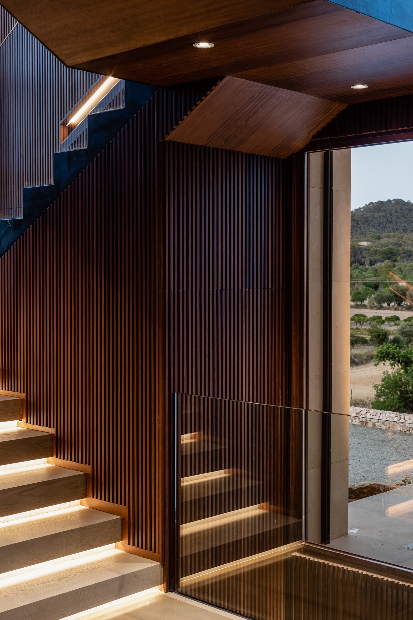El proyecto pretende mostrar, desde la primera percepción, la totalidad de la vivienda, por eso el recibidor se encuentra conectado con el sótano y con la primera planta a través de un triple espacio, que además coincide con las llegadas y arranques de las escaleras que las comunican y con el paisaje a través del gran ventanal.