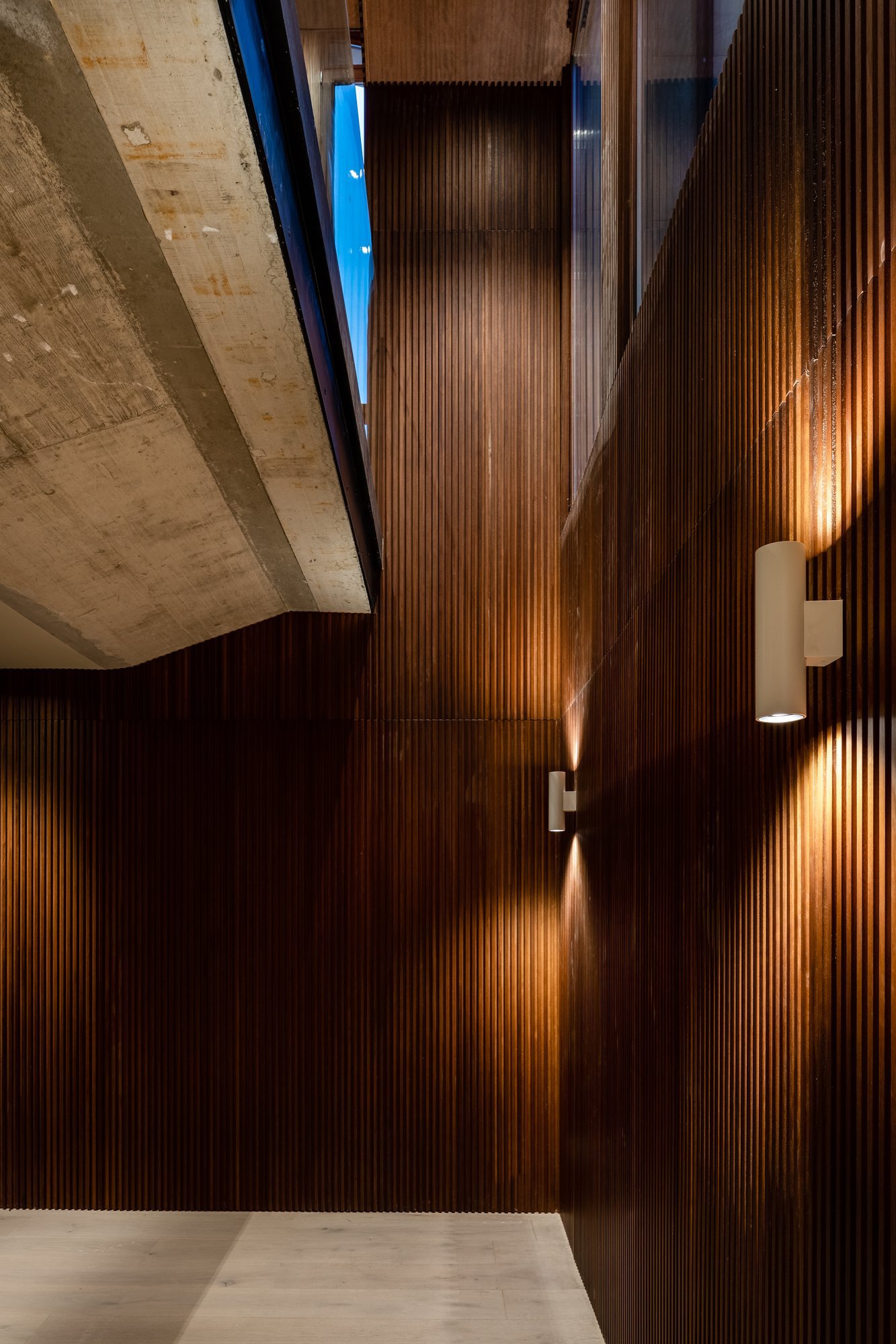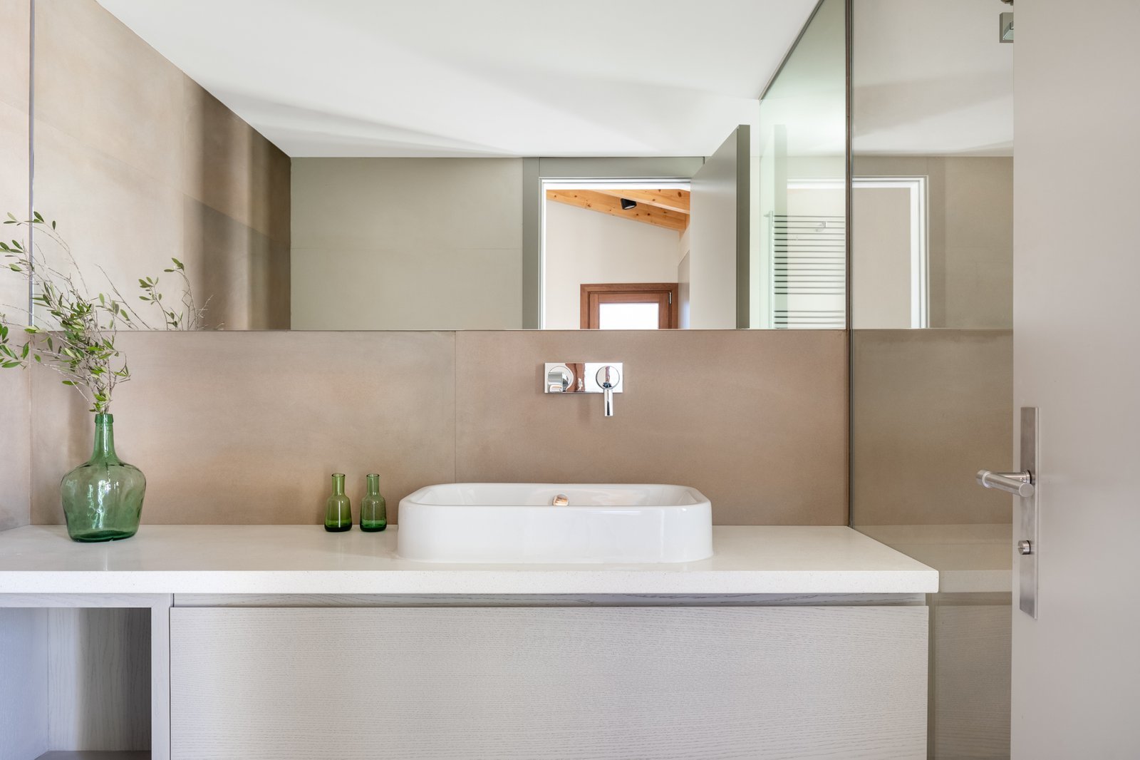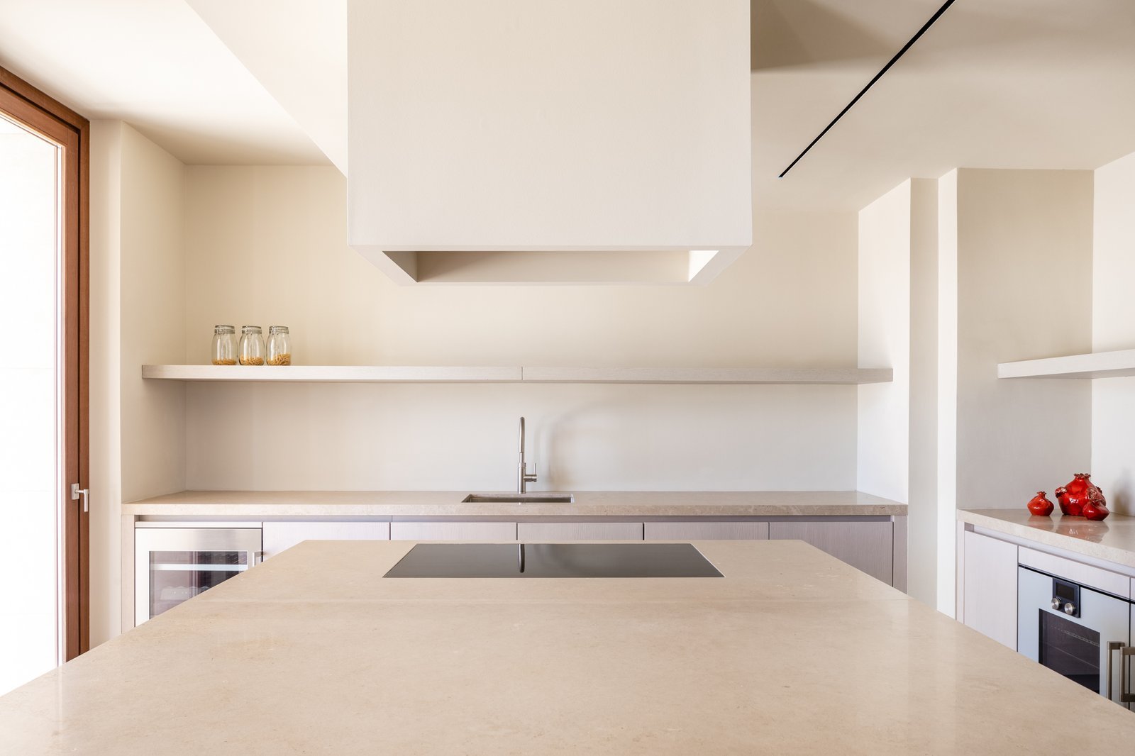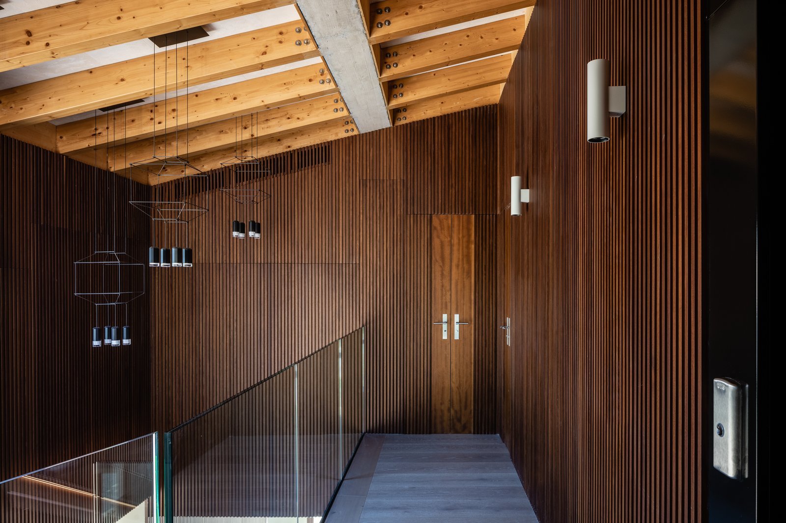 El proyecto pretende mostrar, desde la primera percepción, la totalidad de la vivienda, por eso el recibidor se encuentra conectado con el sótano y con la primera planta a través de un triple espacio, que además coincide con las llegadas y arranques de las escaleras que las comunican y con el paisaje a través del gran ventanal.