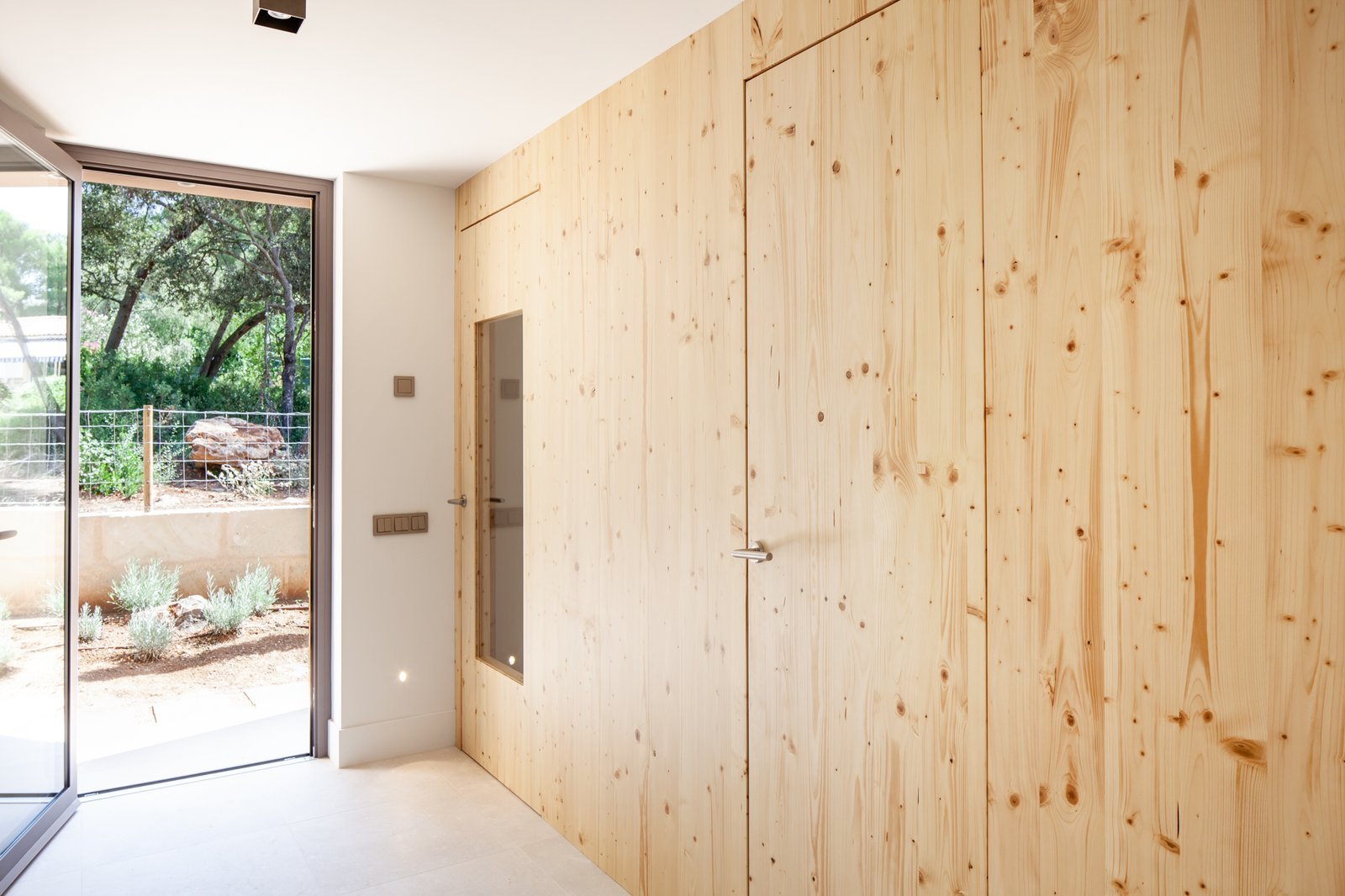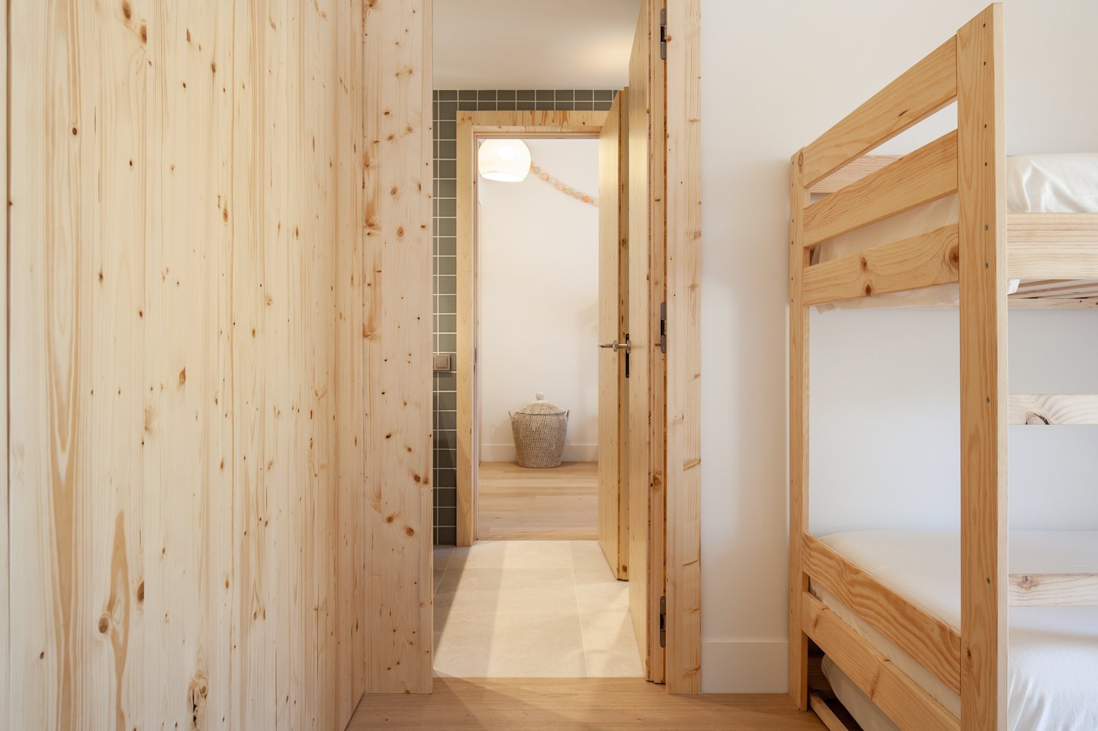 El segundo cuerpo alberga la zona de noche compuesta por cuatro estancias y tres baños, en la que se ha mantenido la misma estructura de la zona de día. Únicamente el acabado del pavimento diferencia ambos cuerpos, materiales siempre naturales, madera en zona noche y piedra en zona día. El equipo de interiorismo amuebló la vivienda con la premisa de la adaptación al entorno, utilizando maderas para el mobiliario e iluminación y lino en los textiles.