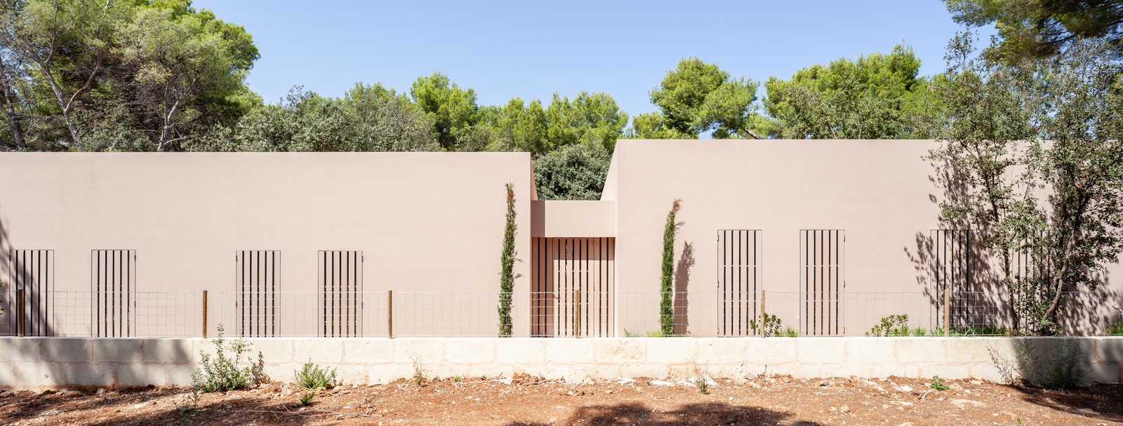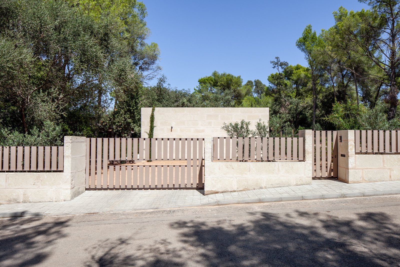 La zona de transición entre el primer y segundo volumen se ha solucionado mediante un muro de marés exento sobre el que descansa una pérgola de cañizo y se sitúa una piscina enfrentada. El muro de marés consigue cuadrar toda la zona exterior, creando un espacio cubierto exterior integrado en el conjunto de la vivienda.