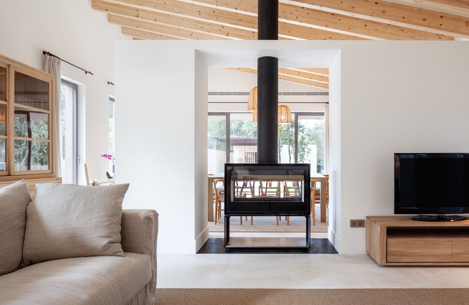 Los espacios de gran altura están amueblados con un mobiliario de formas rectas y sencillas, pero estudiadas teniendo en cuenta las proporciones de las estancias. Las zonas interiores son abiertas y muy amplias, lo que da una sensación de frescura. Para compensar esta sensación y hacer cada rincón de la casa más agradable y acogedor, se optó por el empleo de cortinas en tejidos naturales como el lino. Además, se optó a su vez por el empleo de lámparas decorativas para dar calidez a cada estancia y crear un hogar casero y familiar.
