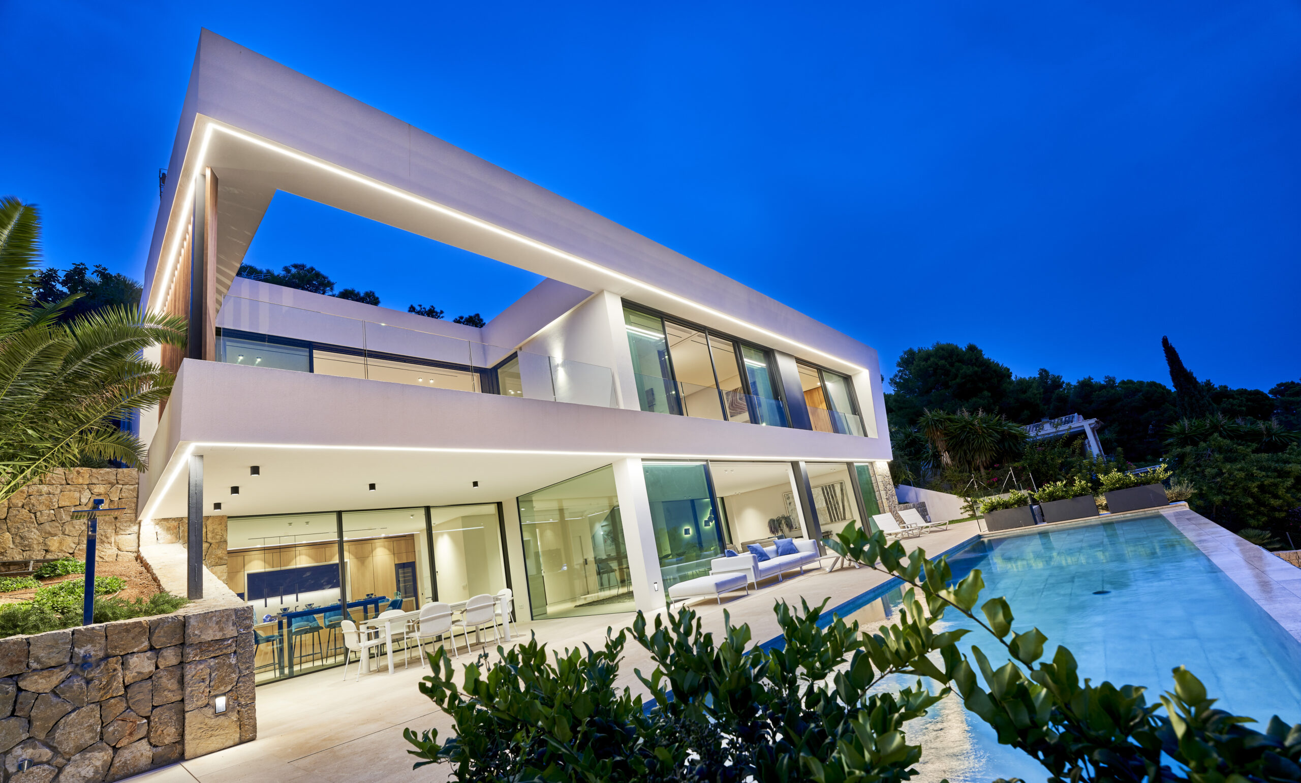 We love to show you the lighting projects we do. It is not always possible to show you images because of the category of houses in which our lighting designers work. This type of high standing homes are usually inhabited by people who demand privacy and we can not always show the final result. We take advantage of every opportunity and with the blue house we have had it, so here it is for you to enjoy this stunning home.
