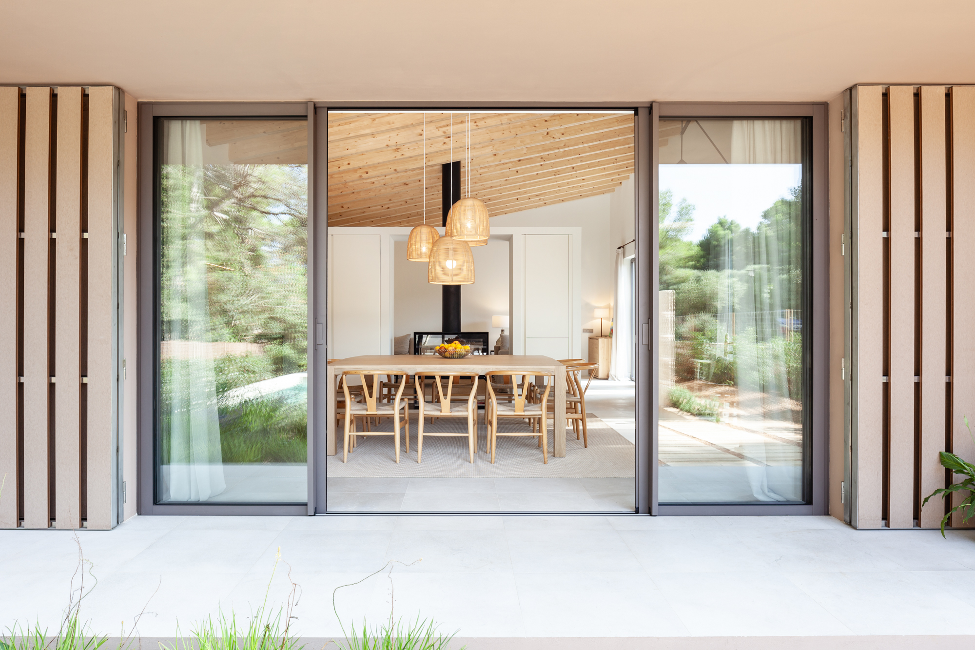 The first body that connects to the pool deck and the pergola, houses the kitchen/dining room and the living room, both separated by a central fireplace that divides both rooms, visually connected thanks to the continuity of the wooden beamed ceiling.