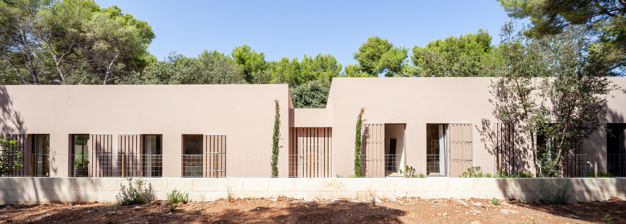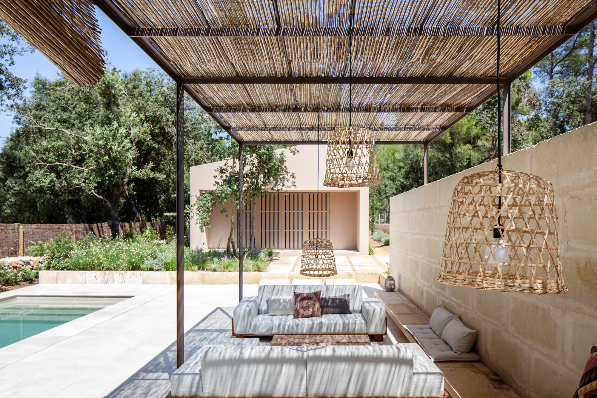 The transition zone between the first and second volume has been solved by means of a free-standing marés wall on which rests a reed pergola and a swimming pool facing it. The marés wall squares off the entire outdoor area, creating a covered outdoor space integrated into the house as a whole.
