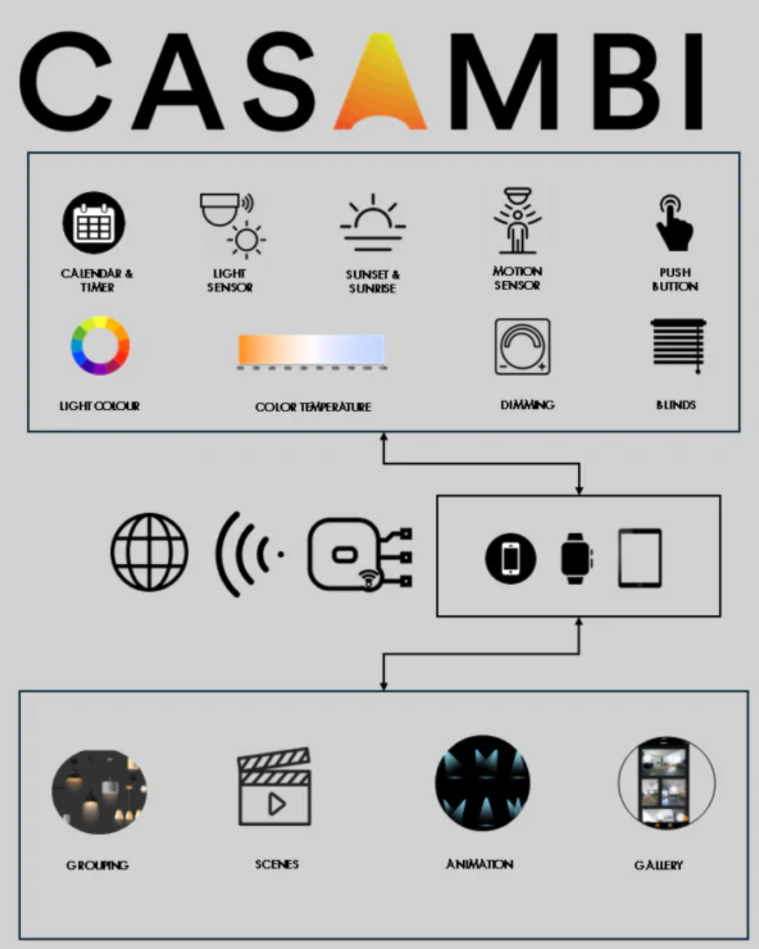 El sistema CASAMBI se basa en la creación de una red Bluetooth que permite la comunicación entre dispositivos para realizar diversas acciones como la regulación de luminarias, creación de escenas, programaciones horarias y uso de sensores de presencia, entre muchas otras funciones. Este sistema descentralizado ofrece adaptaciones en todo momento y es uno de los más completos del mercado, lo que se refleja en la adopción por parte de numerosos fabricantes de iluminación. Para el cliente, la interfaz de CASAMBI es funcional, intuitiva y directa, facilitando enormemente su uso.