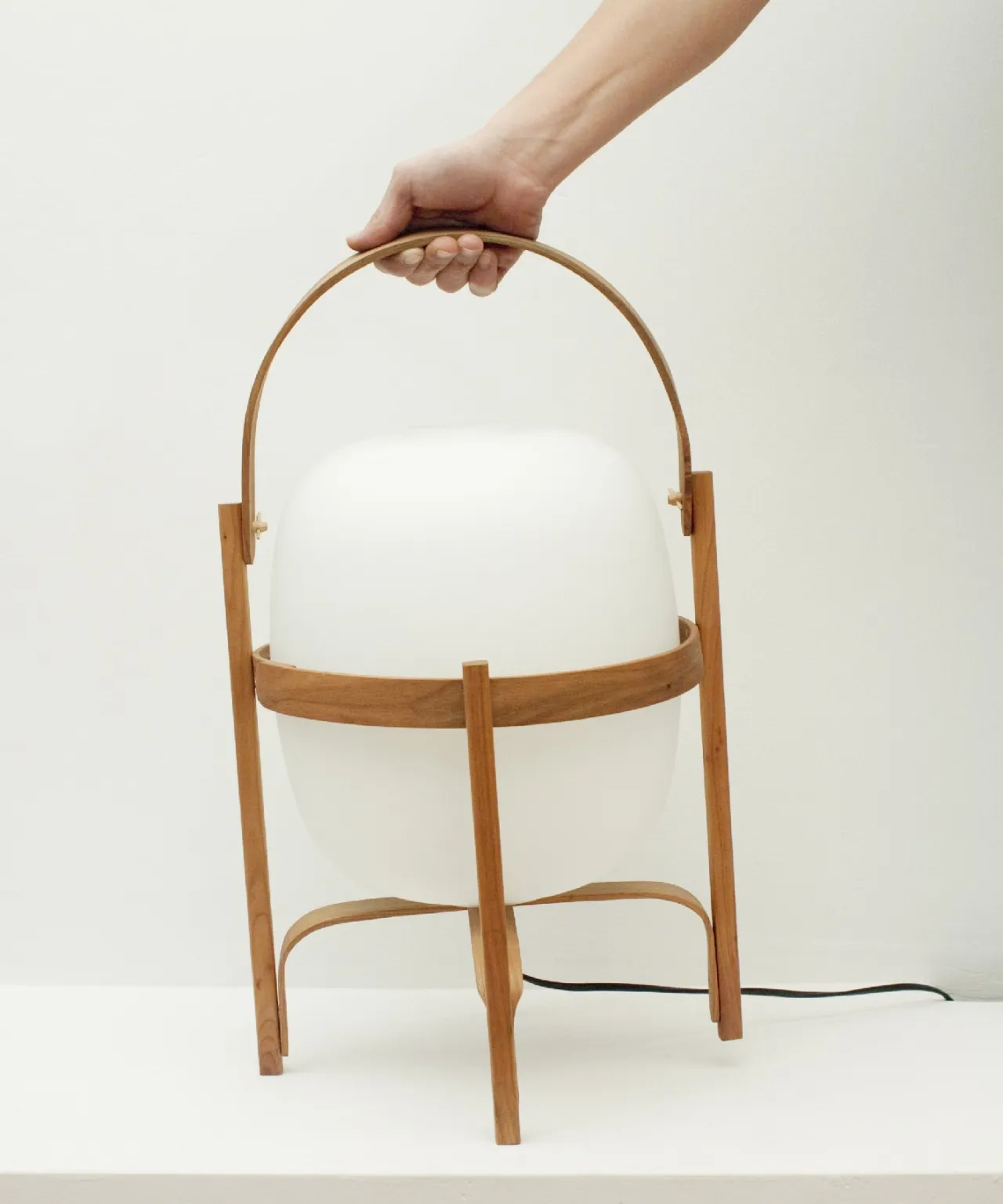 Lámparas icónicas como Cesta de Santa&Cole usan la madera como elemento natural. Antoni de Moragas utiliza un cilindro de madera maciza que se eleva hasta una cabeza luminosa compuesta por tres bombillas, amparadas por una importante pantalla circular. La pantalla de cinta de algodón blanco con nervio lateral de seda evoca a la encuadernación de libros, y su asimetría produce al trasluz unos agradables claroscuros.