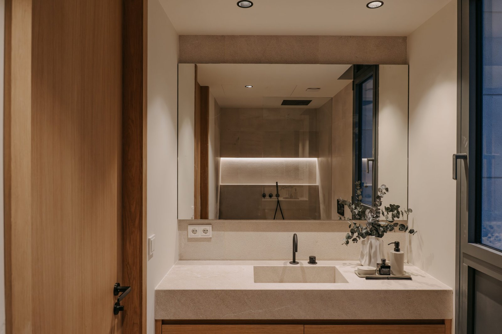 Durante el día, la arquitectura se llena de luz mediterránea. Por la noche, la iluminación artificial mantiene esa misma calma, creando espacios envolventes y equilibrados.