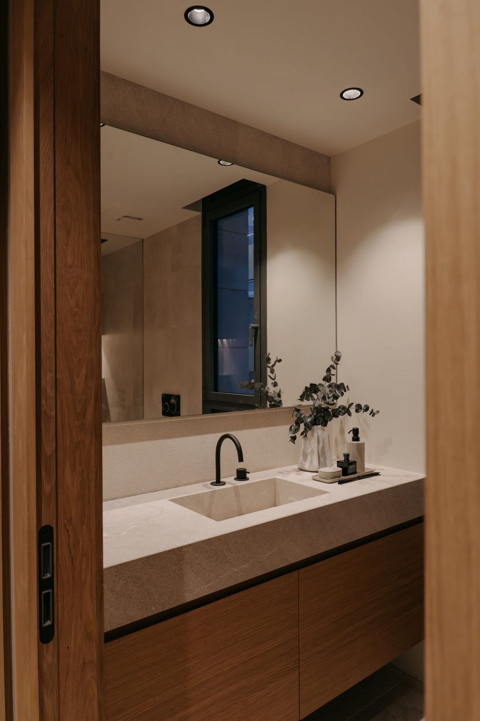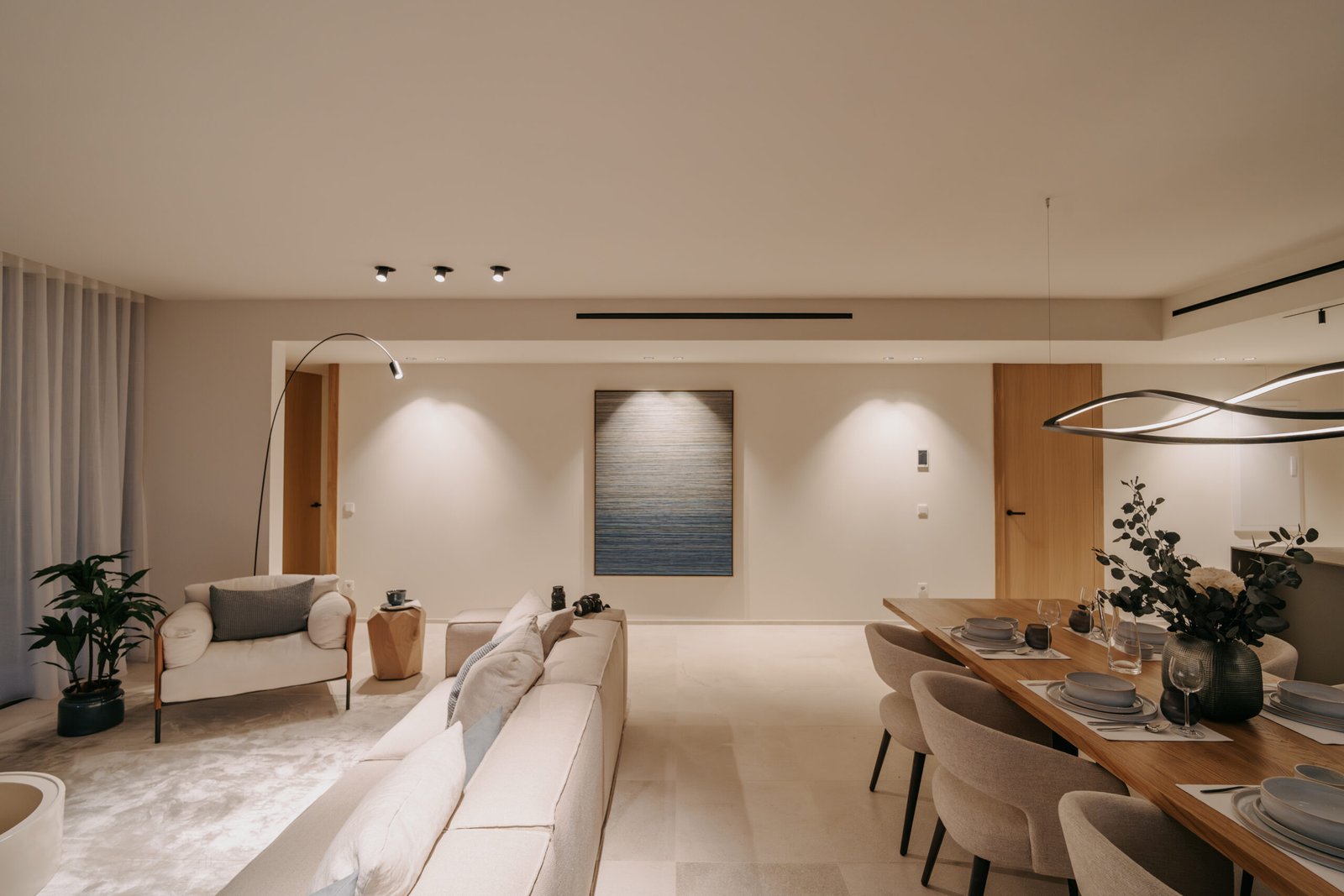 Durante el día, la arquitectura se llena de luz mediterránea. Por la noche, la iluminación artificial mantiene esa misma calma, creando espacios envolventes y equilibrados.
