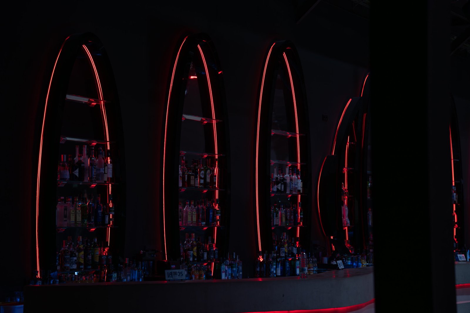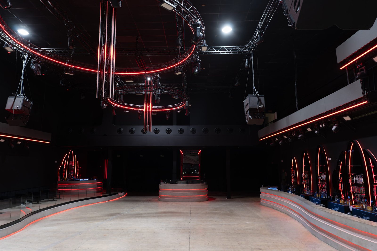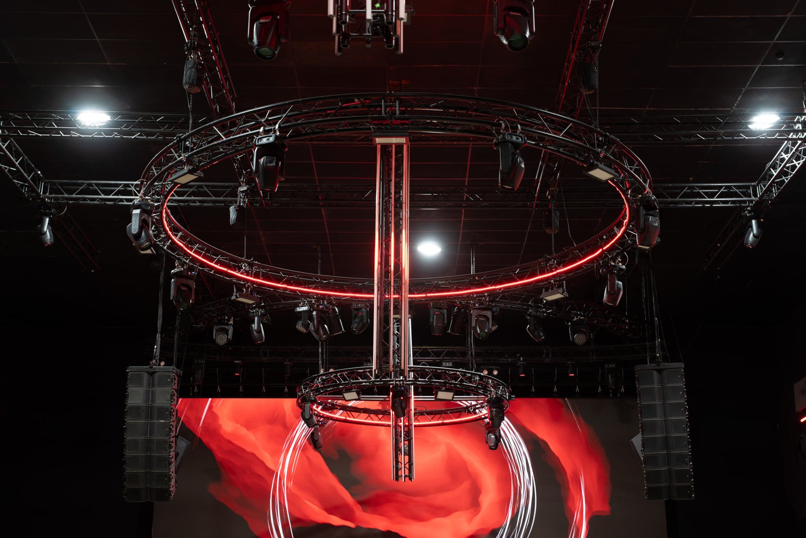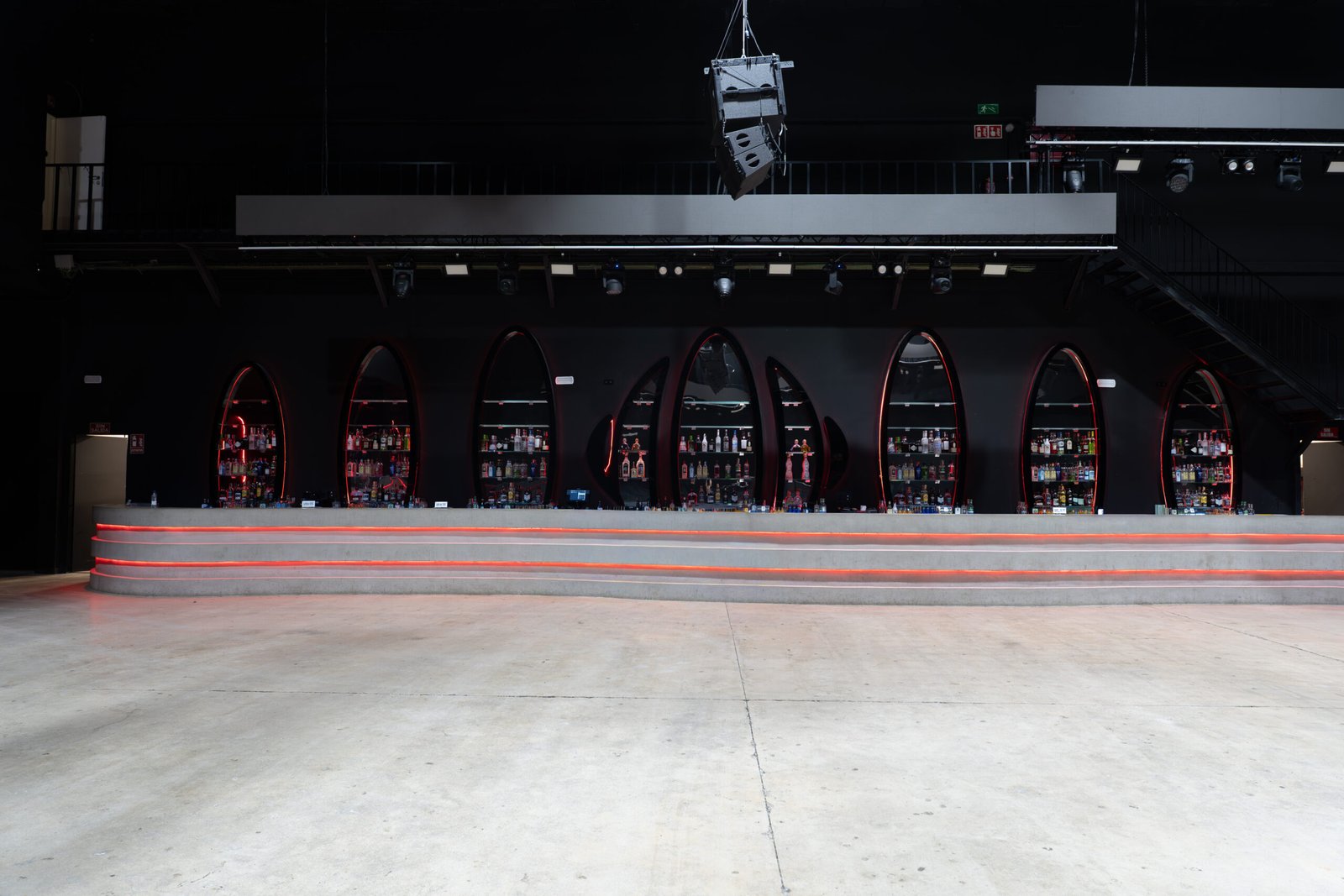 La iluminación, diseñada por Worldlight, es la gran protagonista del proyecto. No busca mostrar el espacio sino revelarlo por fragmentos, tensiona la atmósfera al ritmo de la música. La oscuridad es una decisión de diseño tan deliberada como cualquier punto de luz.