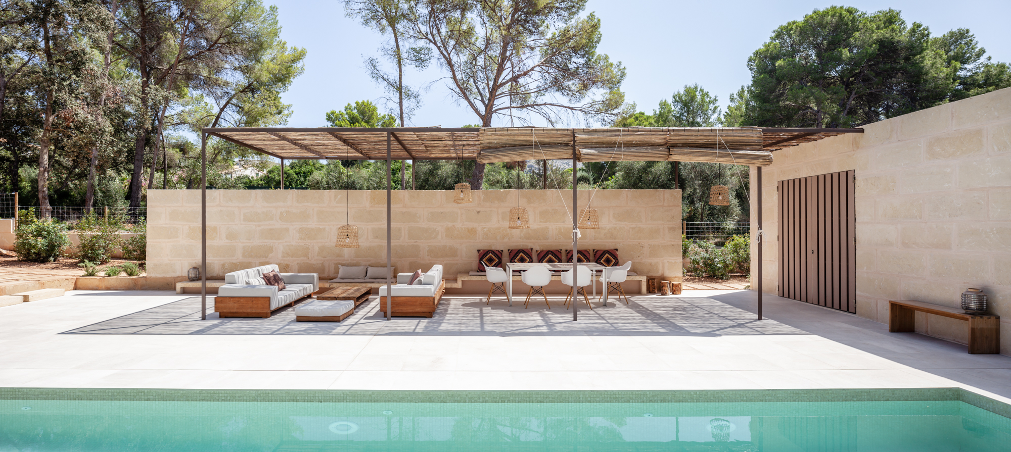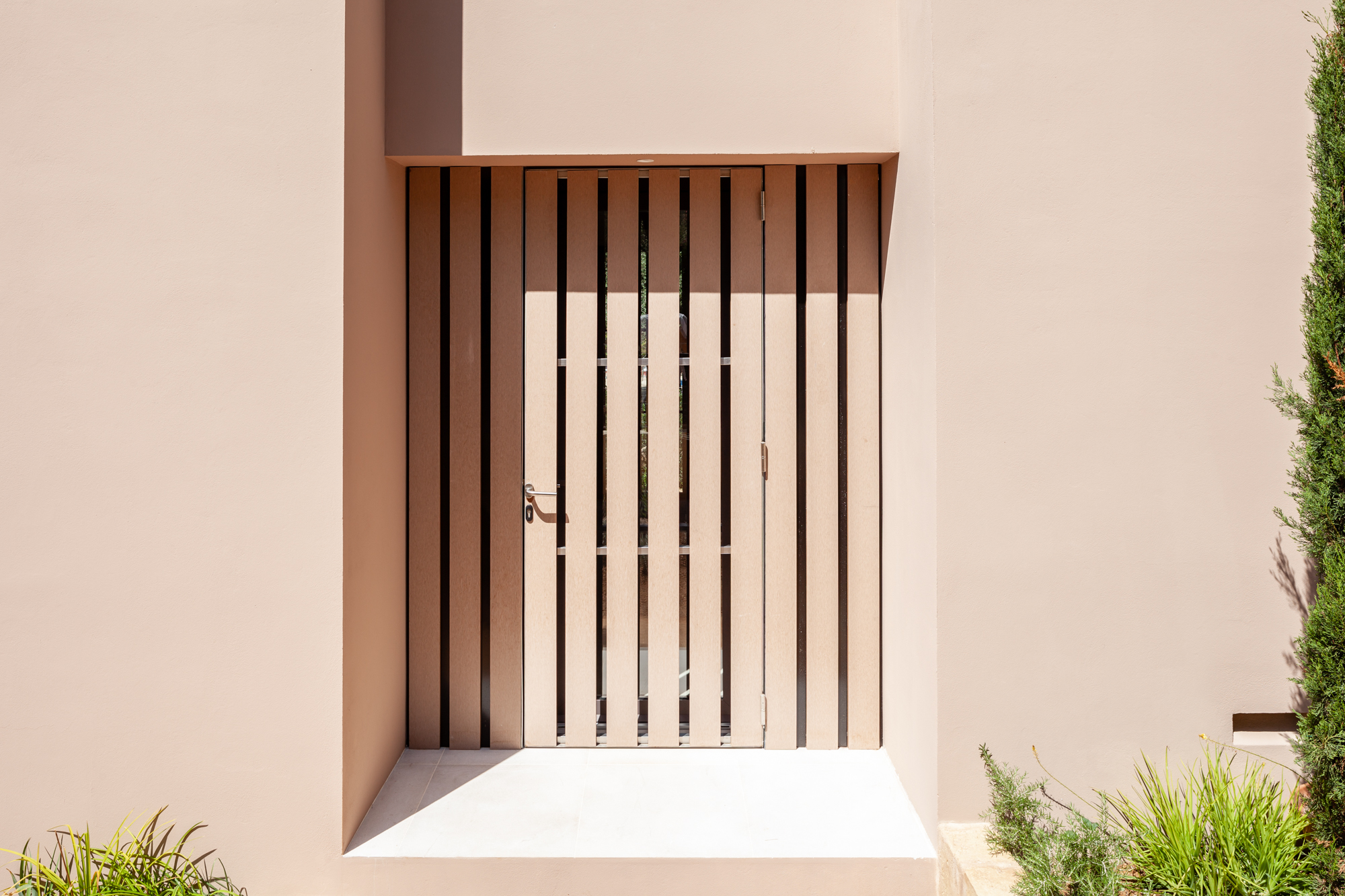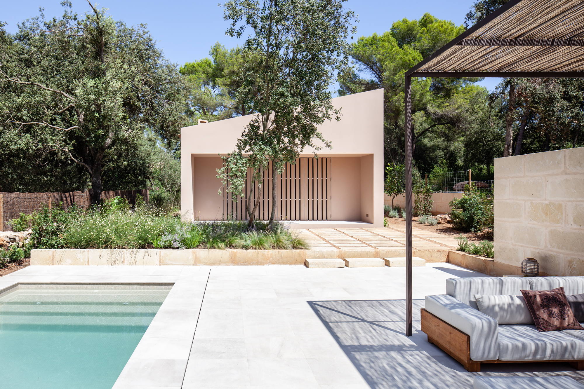 La zona de transición entre el primer y segundo volumen se ha solucionado mediante un muro de marés exento sobre el que descansa una pérgola de cañizo y se sitúa una piscina enfrentada. El muro de marés consigue cuadrar toda la zona exterior, creando un espacio cubierto exterior integrado en el conjunto de la vivienda.