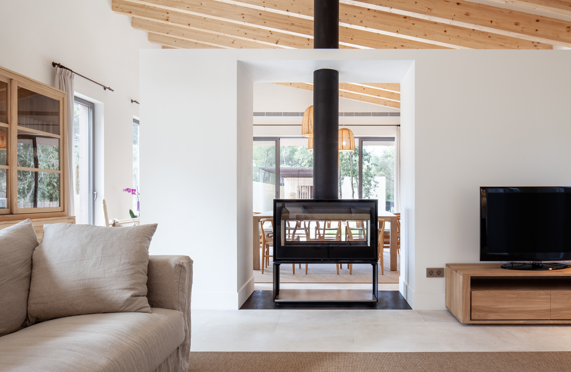 El primer cuerpo que conecta a la plataforma de la piscina y la pérgola, alberga la cocina/comedor y el estar, ambos separados por una chimenea central que divide ambas estancias, conectadas visualmente gracias a la continuidad del techo de vigas de madera.
