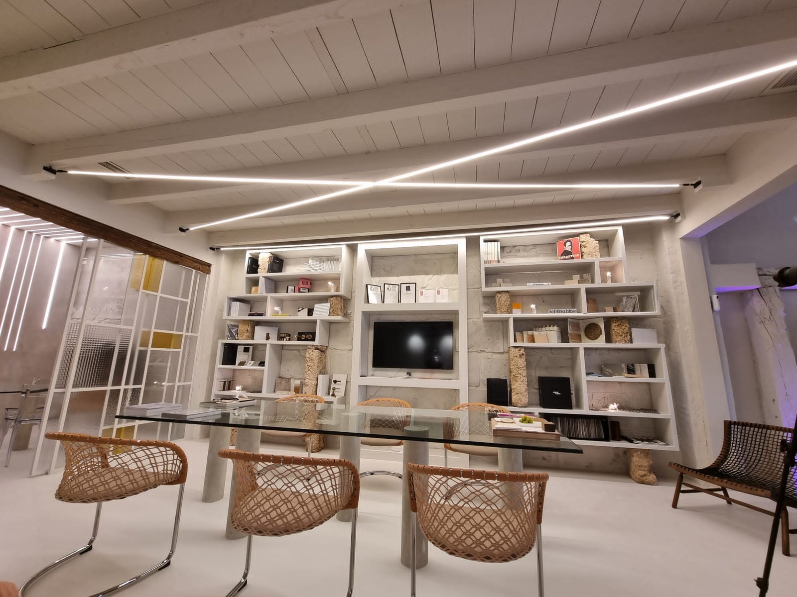 Este espacio único y especial, de carácter expositivo, representa la esencia Minimal a la perfección, la iluminación tiene un gran protagonismo y podemos ver varios elementos como por ejemplo la iluminación puntual para ensalzar obras de arte, mezclado con iluminaciones artísticas o decorativas, pasando por el led lineal como iluminación técnica.